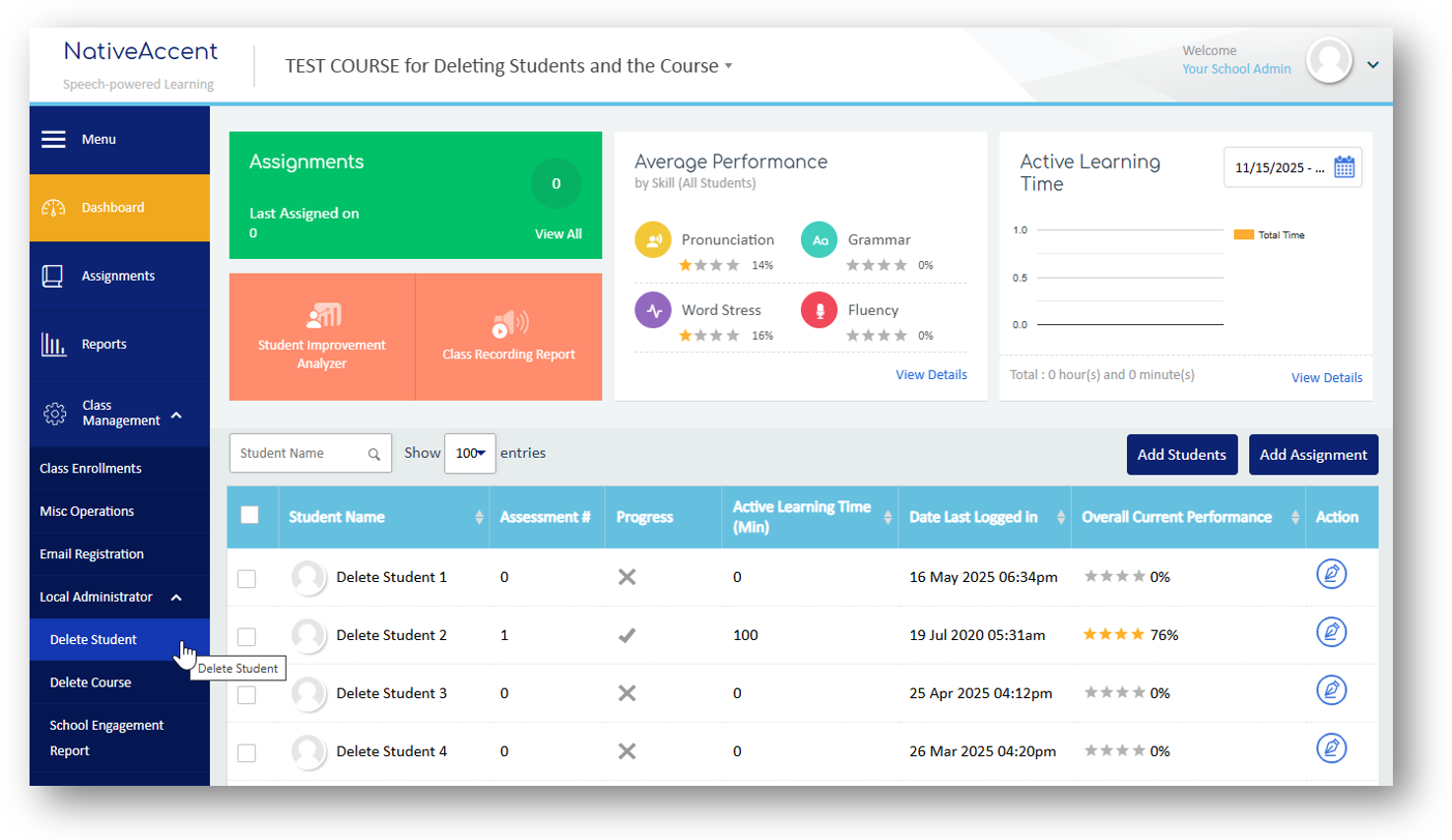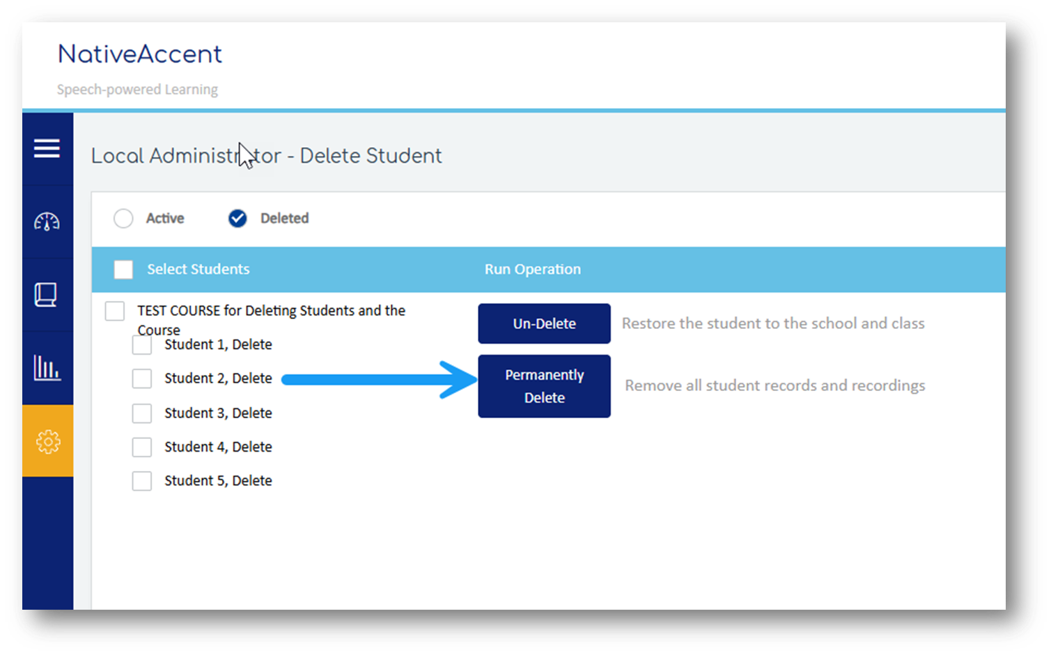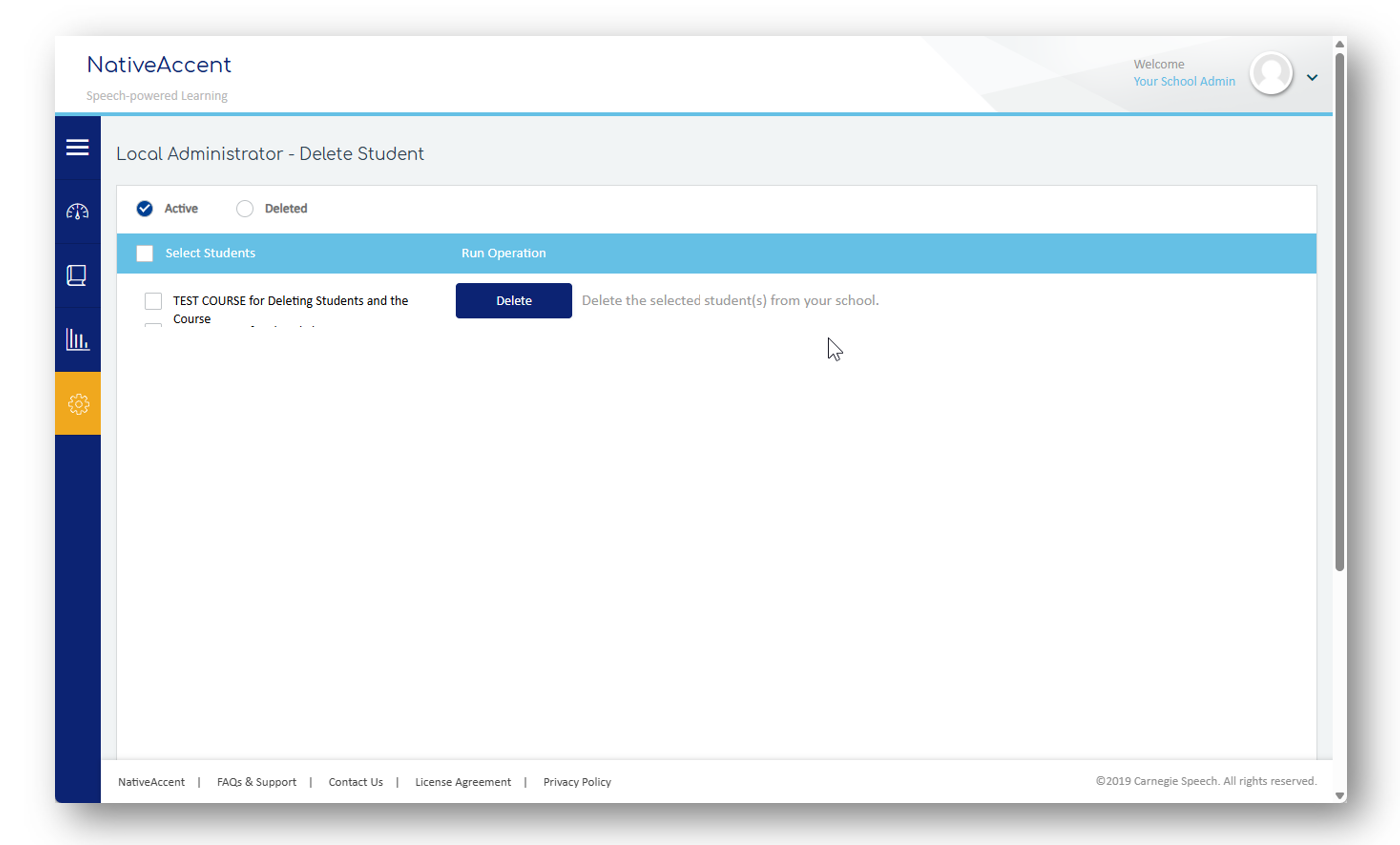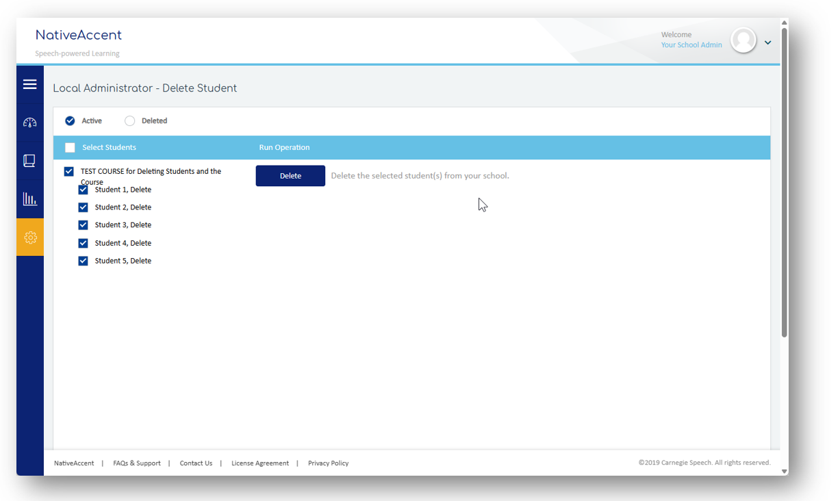 The deletion of students’ personally identifiable information is required under the FERPA and GDPR. Carnegie Speech provides tools to accomplish this task. These tools are only available to the Local Administrator. The team at Carnegie Speech doesn’t know which student accounts need to be deleted.