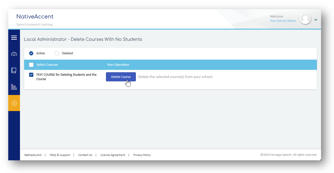 Deleting Courses is an essential part of managing your school in NativeAccent. The deletion process outlined below details how to delete courses; however, the Local Administrator, in collaboration with teachers, will determine when to delete courses.