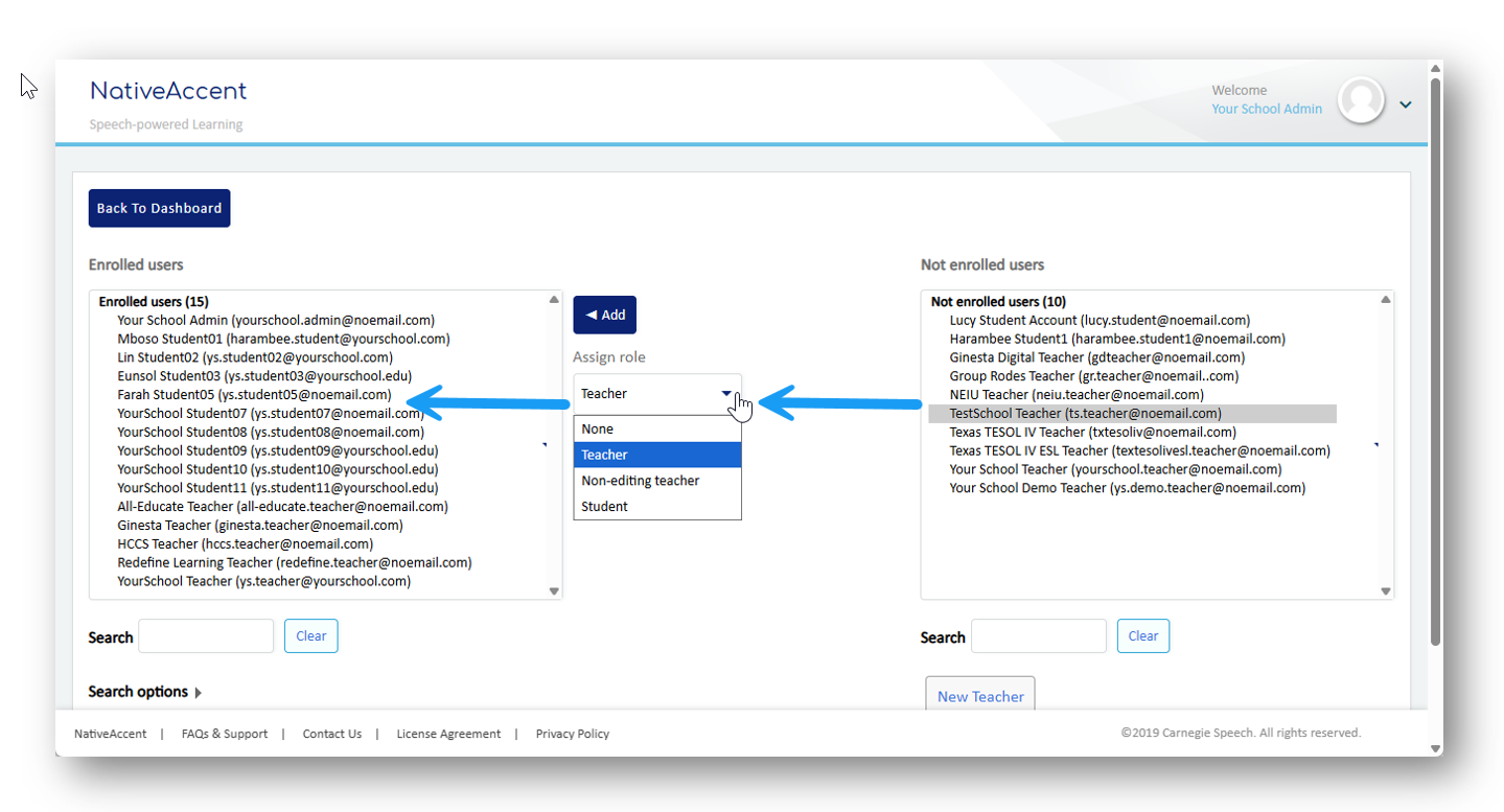 - Select the teacher's account in the list on the right labeled Not Enrolled Users