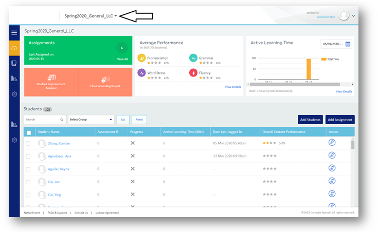 First, navigate to the target course by clicking the down arrow next to the course name on the Local Admin Dashboard.