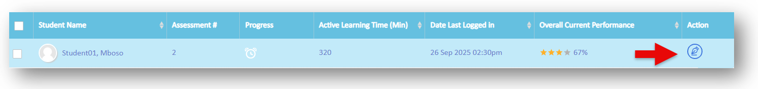 In the teacher's view, the student's name is on the class roster. Next to the student name is the "pen tip" action icon.