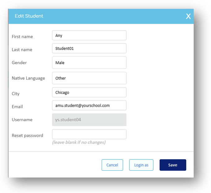 Click the pencil to edit student information, except the student's selected username. You can also "log in as" that student to see their learning path and activities.